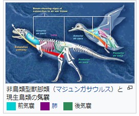 (※2)・気嚢(きのう、英: Air sacs)は、鳥類が備えている呼吸器官である。鳥類の祖たる恐竜にもほぼ同様の器官が存在したことが研究によって示唆されている。中生代に恐竜が哺乳類よりも繁栄を成功させたのは、この呼吸システムのためとも言われており、古生代末から中生代はじめにかけての低酸素時代(火山活動の増大による大気中の二酸化炭素濃度の増大による)にこの形質が著しく適応的な形質となって、恐竜の台頭を招いたのではないかとの仮説も提唱されている。https://ja.wikipedia.org/wiki/%E6%B0%97%E5%9A%A2
