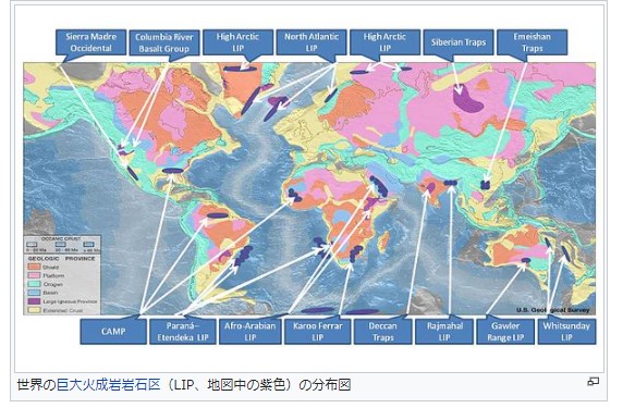 洪水玄武岩:大陸地域で非常に膨大な量の玄武岩質溶岩が噴出しできたと考えられている玄武岩の巨大な岩体のこと。その地形から台地玄武岩とも呼ばれている。古生代カンブリア紀以後何回か発生している。https://ja.wikipedia.org/wiki/%E6%B4%AA%E6%B0%B4%E7%8E%84%E6%AD%A6%E5%B2%A9